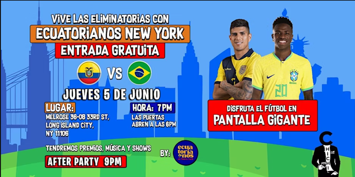 ECUADOR VS BRASIL ENTRADA GRATIS Thursday, June 5, 2025 6:00 PM 11:00 PM Melrose Ballroom 36-08 33rd Street Queens, NY, 11106 United States (map) Google Calendar ICS Don't miss this exciting live match between Ecuador and Brazil at the Melrose Ballroom! Admission is FREE, so gather your friends and come support your country. It will be a night full of excitement and good football! Let's qualify! Get Tickets