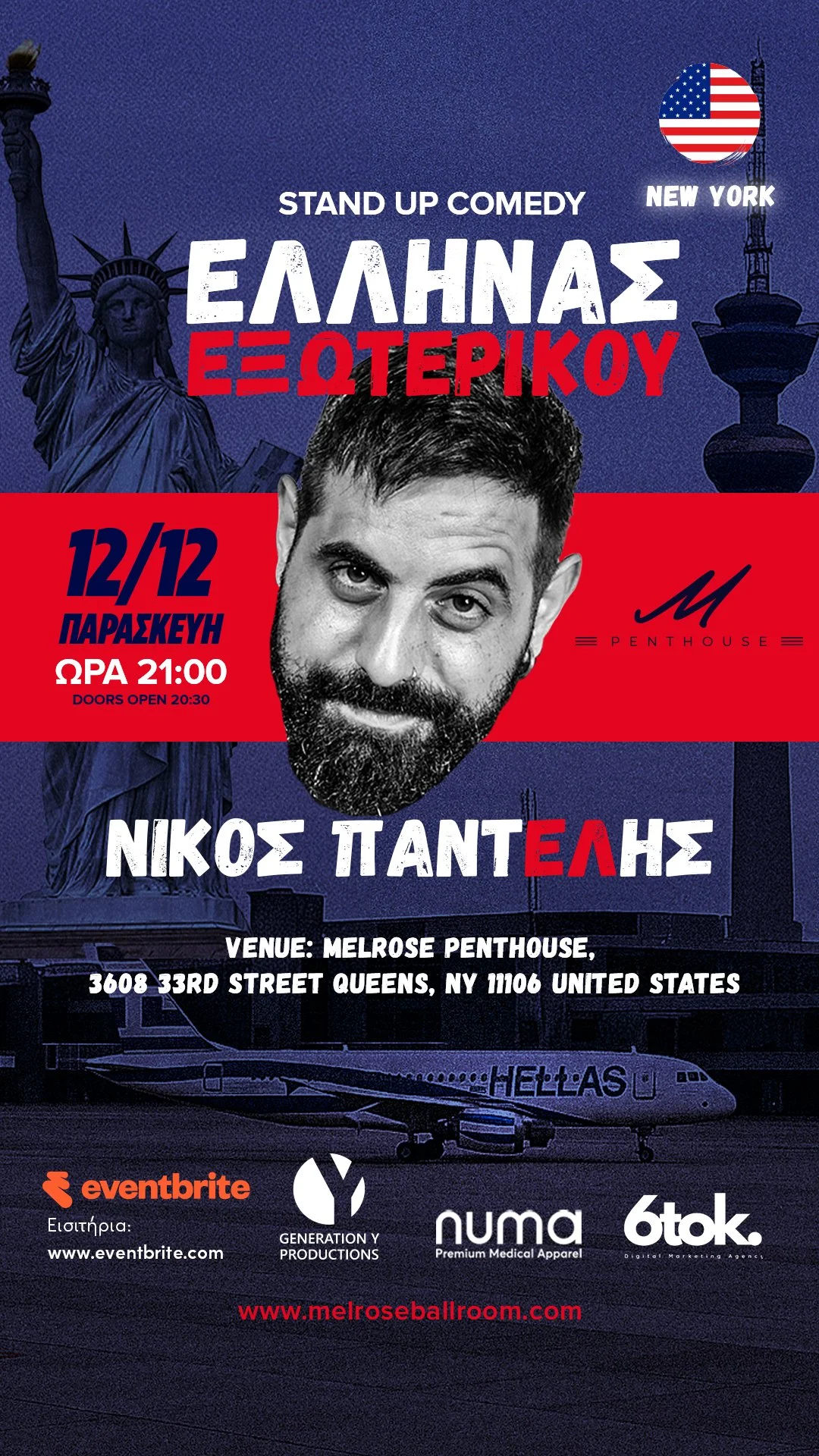 Greek Abroad: A Comedy by Nikos Pantelis Friday, December 12, 2025 9:00 PM 11:30 PM Melrose Ballroom 36-08 33rd Street Queens, NY, 11106 United States (map) Google Calendar ICS Nikos Pantelis (or simply Pantelis) is coming to New York with his hit solo show “Greek Abroad” — a night full of laughter, raw truths, and just the right amount of awkwardness. GET TICKETS