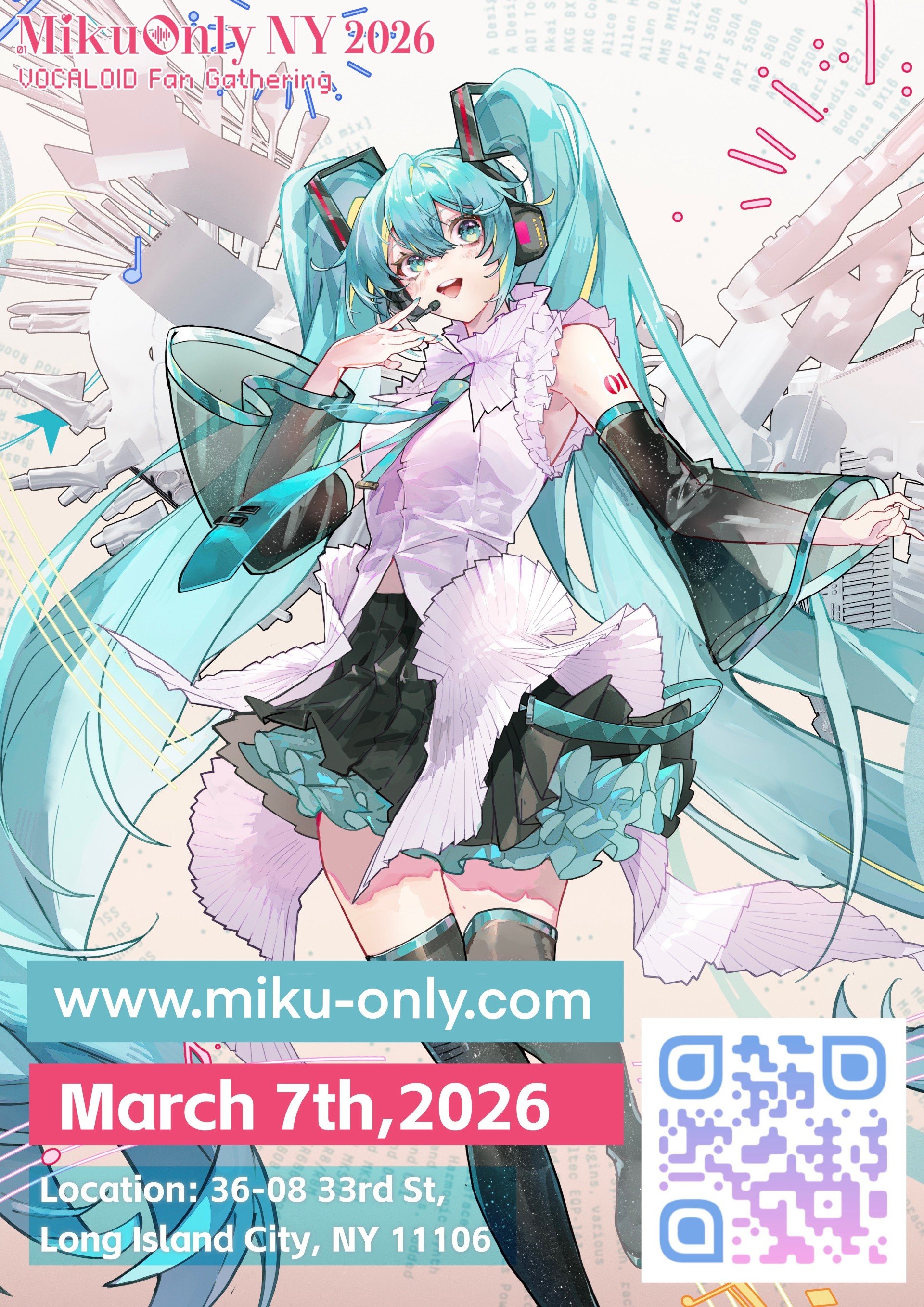 Miku Only NY 2026 Saturday, March 7, 2026 12:00 PM 6:00 PM Melrose Ballroom 36-08 33rd Street Queens, NY, 11106 United States (map) Google Calendar ICS MikuOnly NYC 2026 is officially starting! Cross the screen and step into the spotlight, where your performance brings the virtual world to life. Kick off your year on our stage with melodies of magic and symphonies of dream. Get Tickets