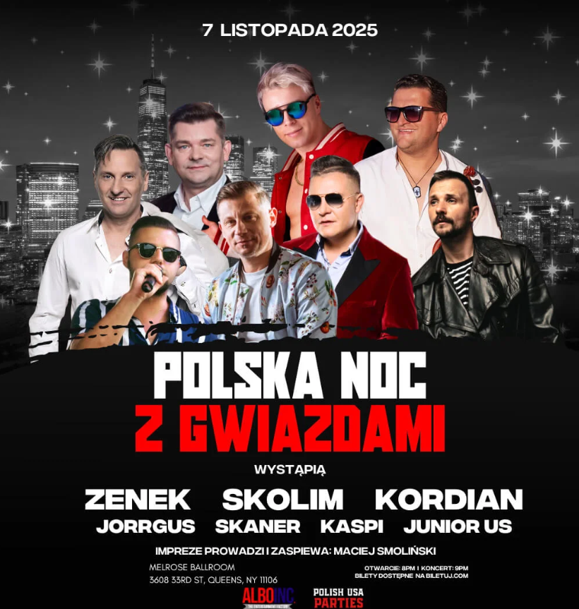 We invite you to the Polish Night with the Stars, during which you will hear the hits of disco polo music! On November 7, 2025, the following artists will perform for you at the Melrose Ballroom: Zenek Martyniuk, Skolim, Kordian, Jorrgus, Skaner, Kaspi and Junior US. The event will be hosted and sung by: Maciej Smoliński.